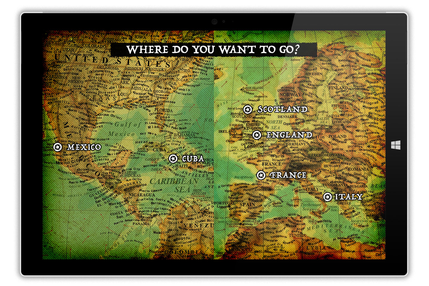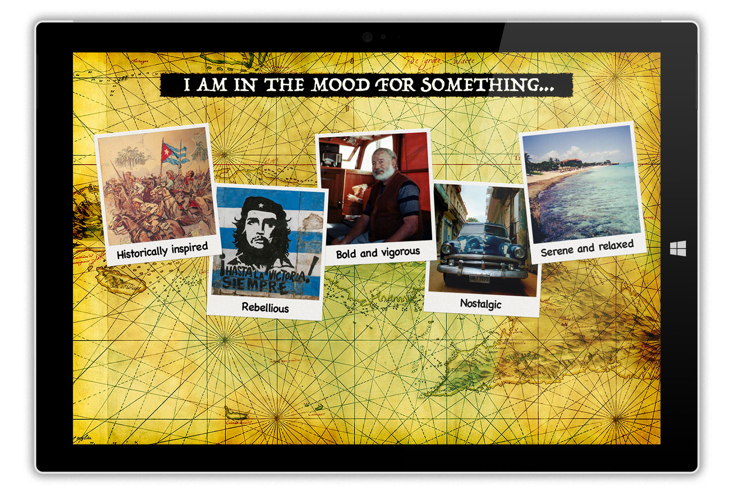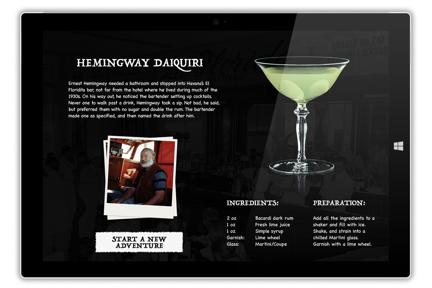 The 'Cocktail Adventure' presents the entire portfolio of Bacardi's spirits and the cocktails that could be created using these. The application takes users on a spirits journey where each of the countries hosts a specific spirit. After selecting the base spirit, users can then choose the cocktail setting and have one of Bacardi's many signature recipes presented along with the cocktail's history, ingredients, and steps of preparation. Following that, the user can engage in a new adventure or explore similar cocktails.