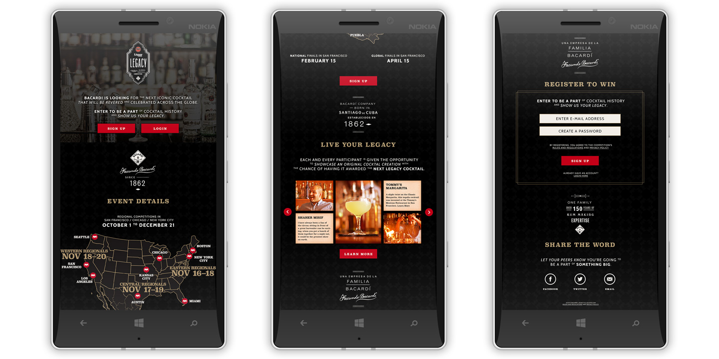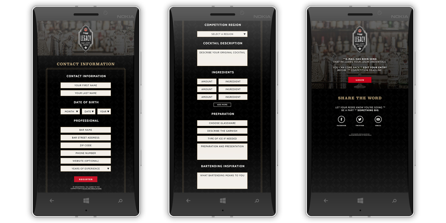 One of Bacardi's most prestigious events—'Bacardi Legacy' is where world's best bartenders create rum cocktails inspired by over 150 years of the Bacardi legacy. In order to sign-up for the contest, a fully responsive, mobile-first microsite was developed that allowed participating bartenders to create a profile and submit their signature recipes. Contenders could then log-in and either update their profiles or turn in new recipes as they progressed through the contest.