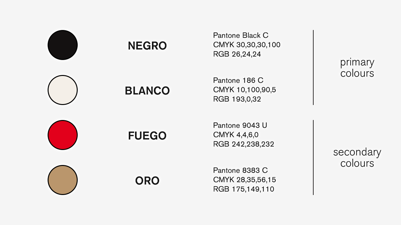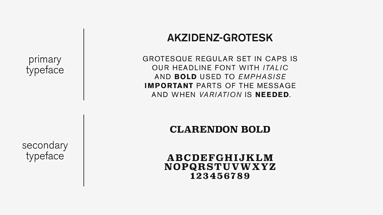 As per Bacardi's universal style, the primary colours for the brand are Negro and Fuego. Secondary to these are Blanco and Oro, which should be used as accent colours. Akzidenz-Grotesk is one of the earliest sans serif fonts cut specifically for hot-metal typesetting. It is an extremely versatile and timeless font with variety and functionality. It can be used large or in smaller sizes as subheadings or footnotes. The secondary headline display fonts, Clarendon Bold is used to add variation and interest.