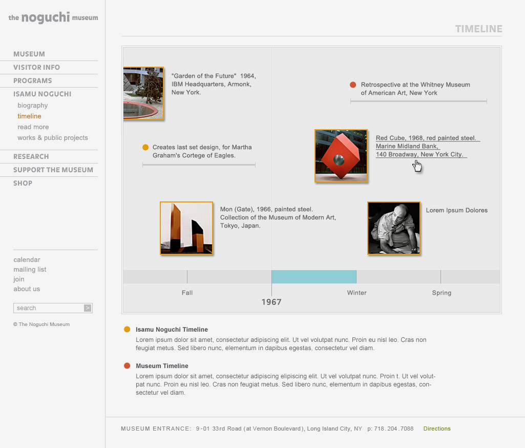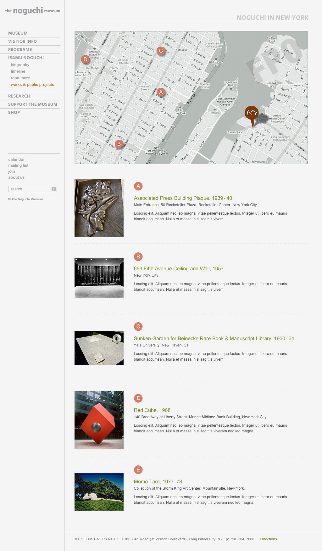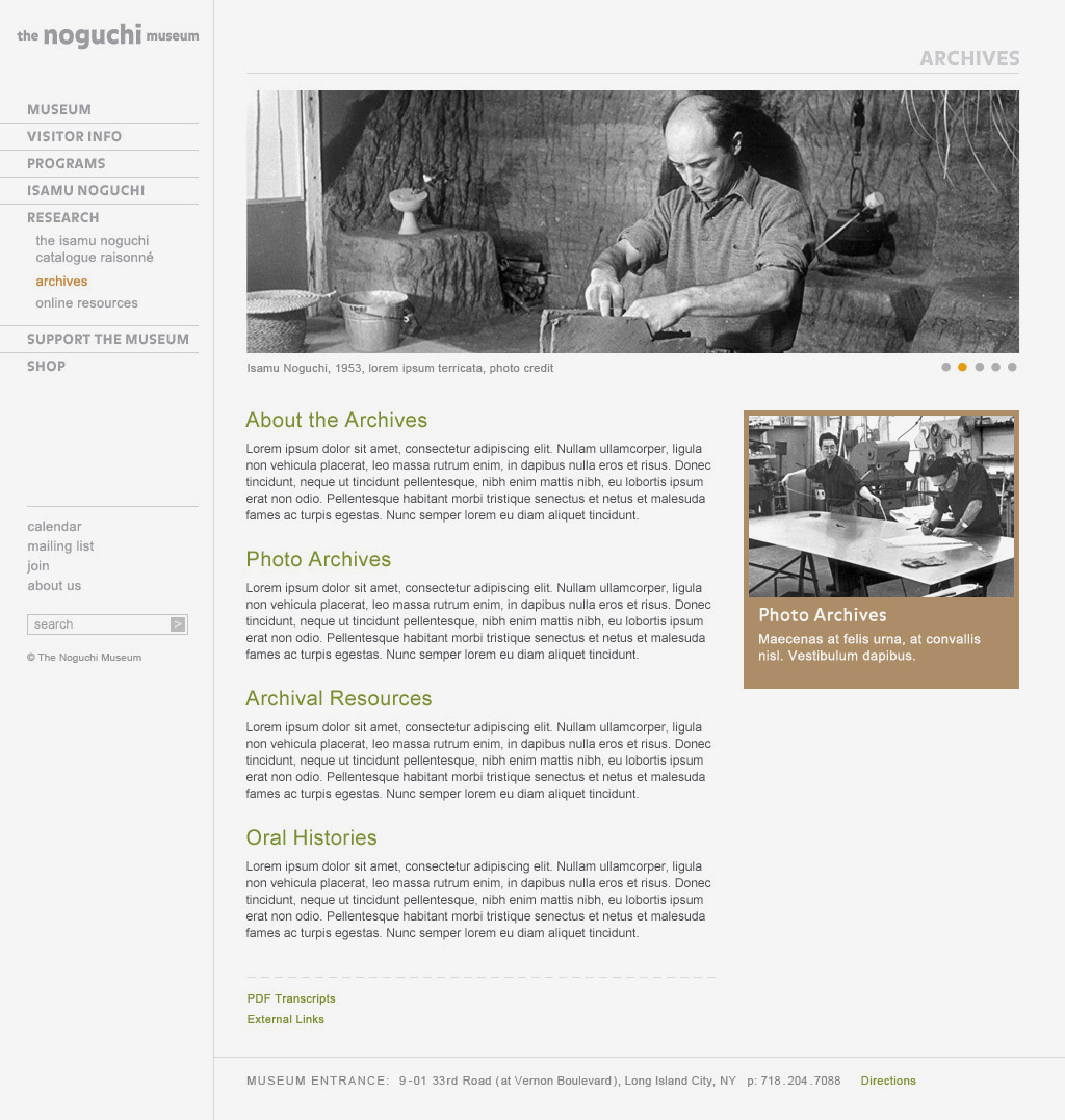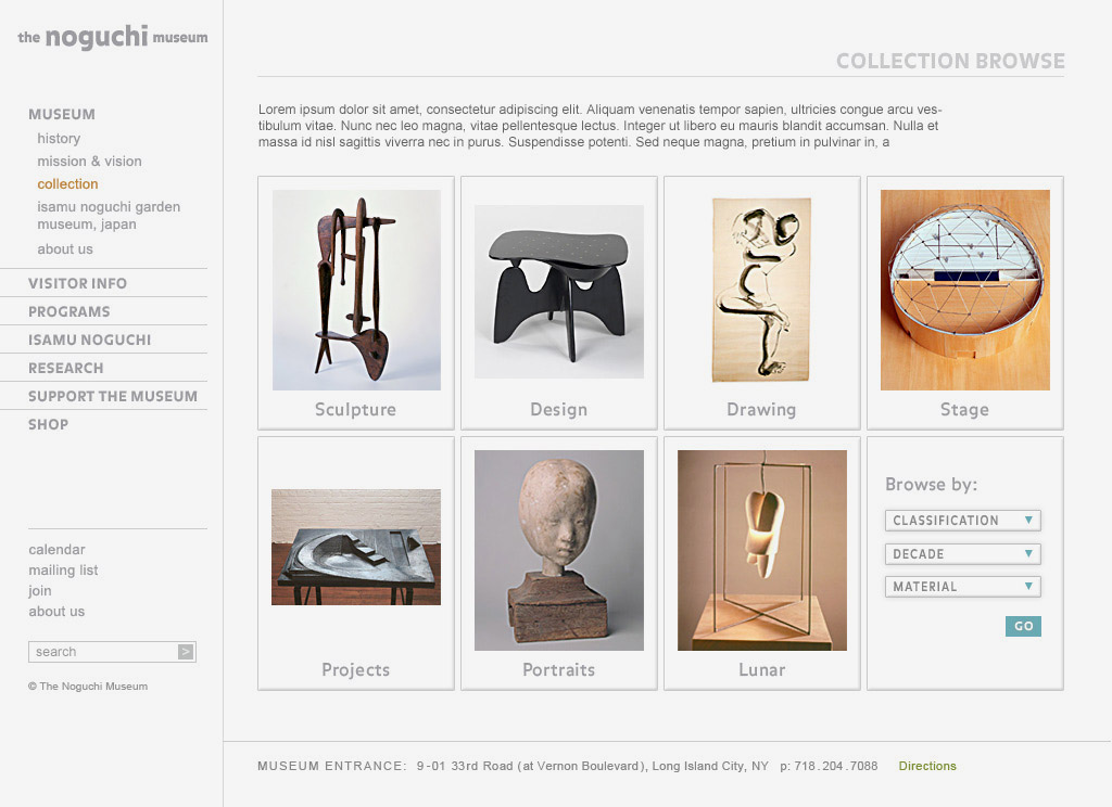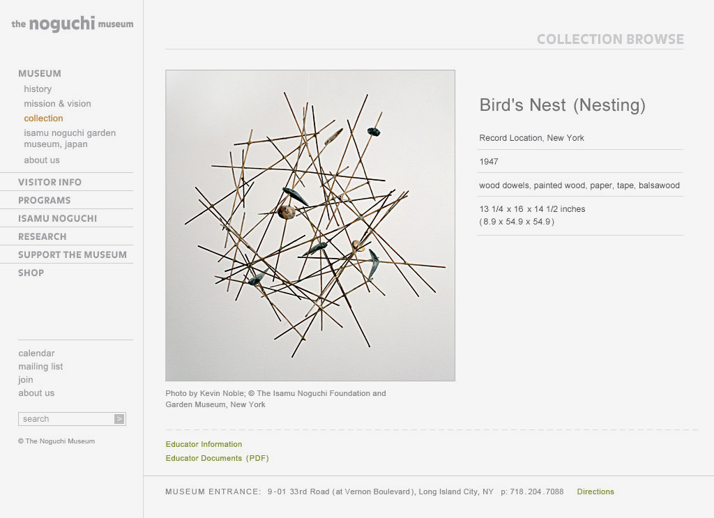 The Noguchi Museum website was developed for the internationally renowned sculptor Isamu Noguchi and displays the representative examples of the artist's body of work. It actively seeks to provide knowledge, inspiration, and stimulation for its current audiences, to attract new audiences and to provide an accessible resource for future generations.