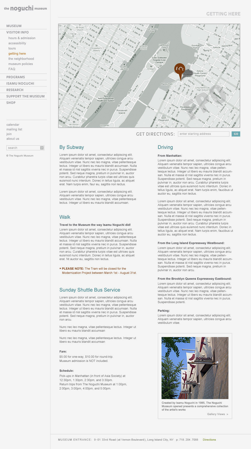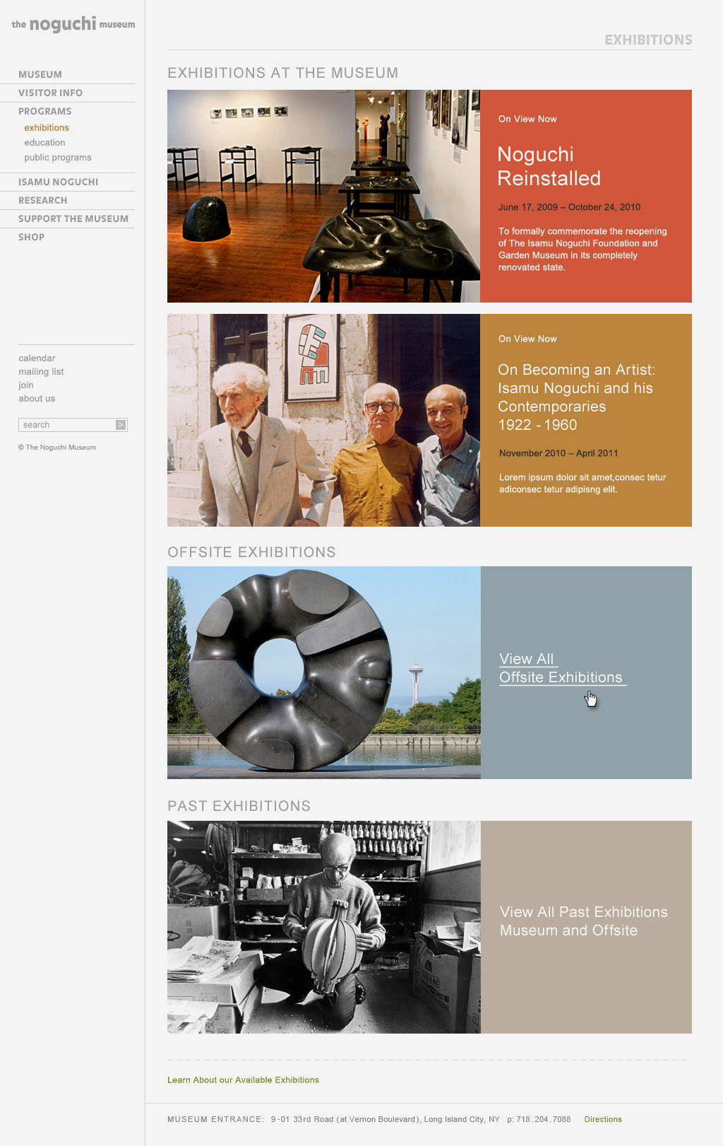 One of the core reasons to redesign the Noguchi online experience was to make information easily accessible while adding new features such as an online store and allow administrators to manage upcoming exhibitions. In addition to being able to clearly find directions and hours of operation, users can now also order Noguchi's collection items online and purchase tickets and membership directly online in order to avoid having to queue-up at the entrance.
