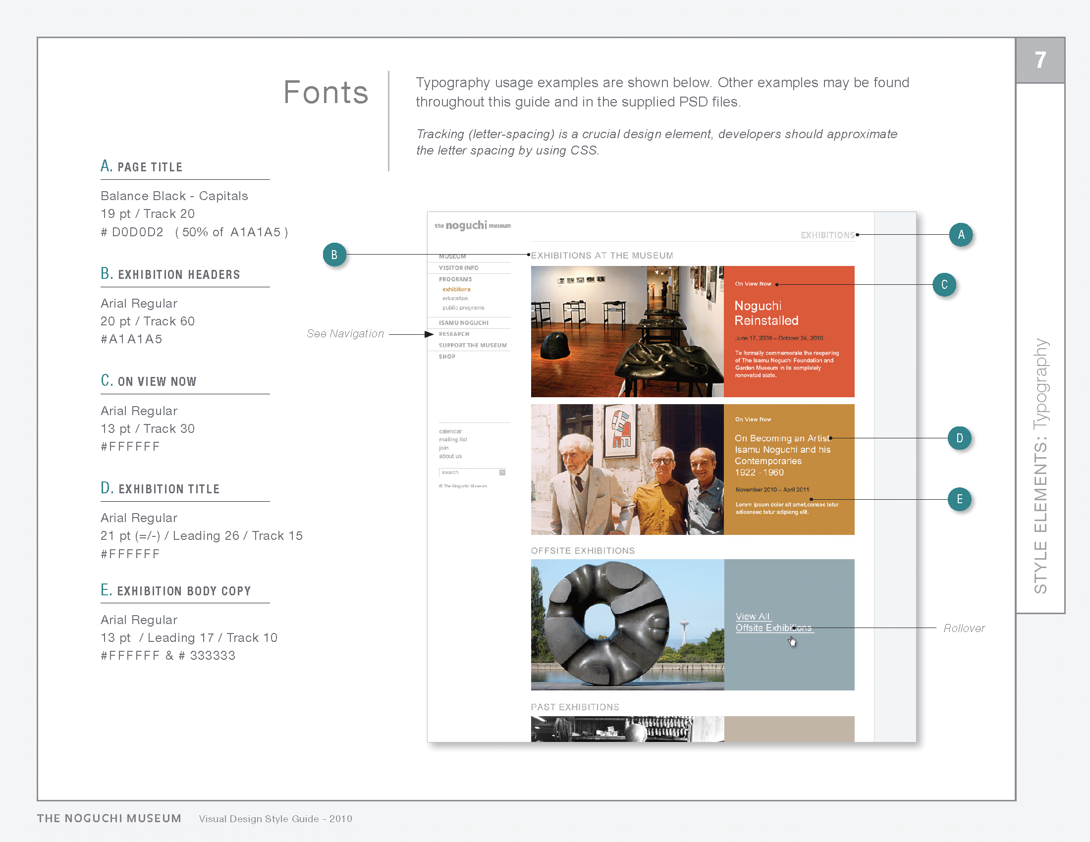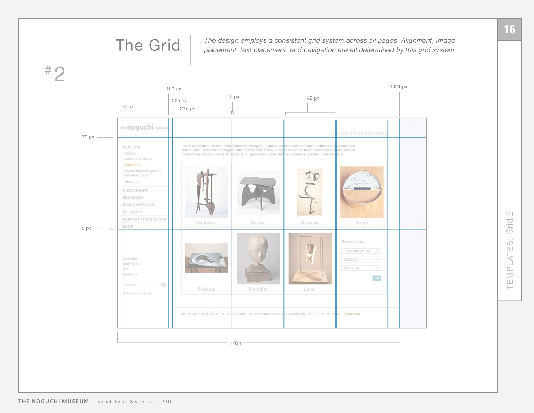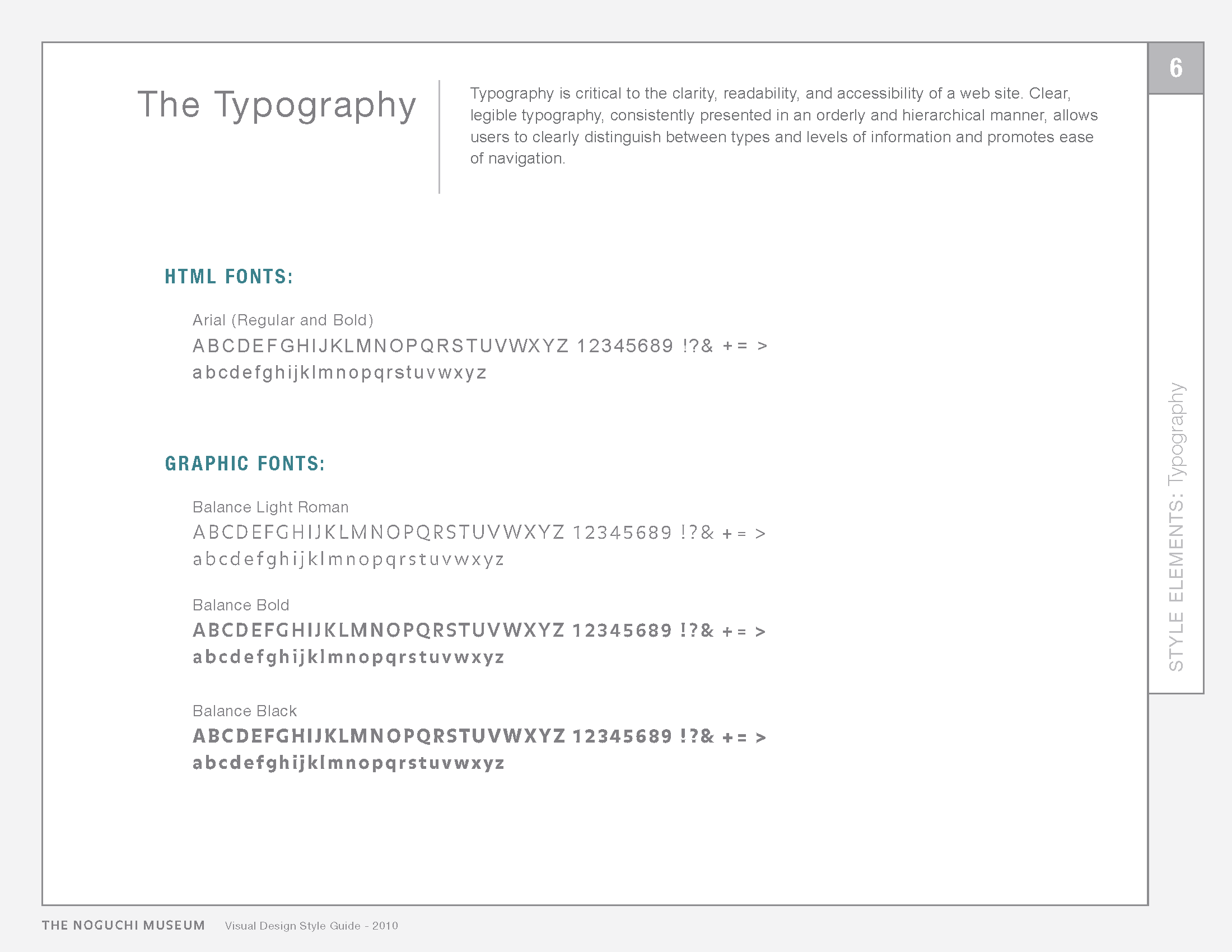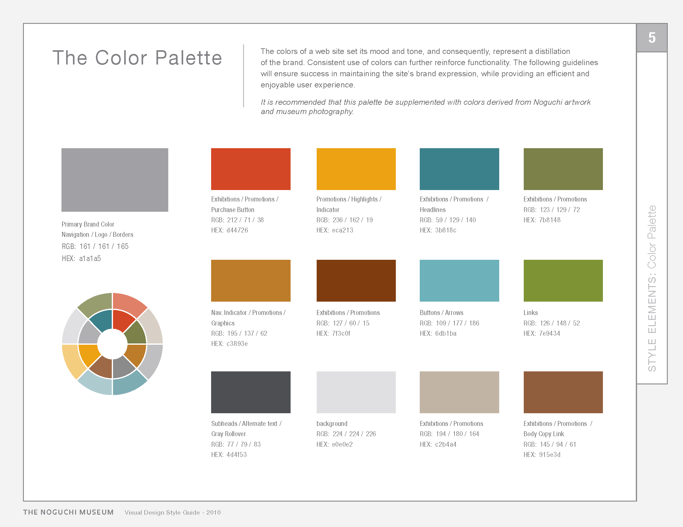 The style guide was designed based on the unique aesthetics of the Noguchi Museum. The colours of the website set its mood and tone, and consequently, represent a distillation of the brand. Consistent use of colours further reinforce functionality and ensure success in maintaining the site's brand expression, while providing an efficient and enjoyable user experience.