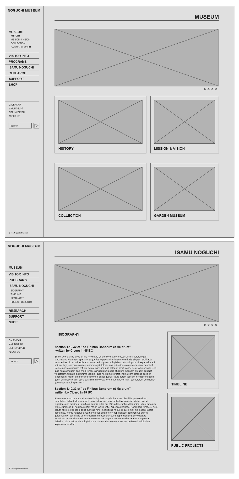 These are some screenshots from the live Noguchi website that exhibit the application of the mood boards, information architecture, style guides, information architecture and visual designs in the final product.