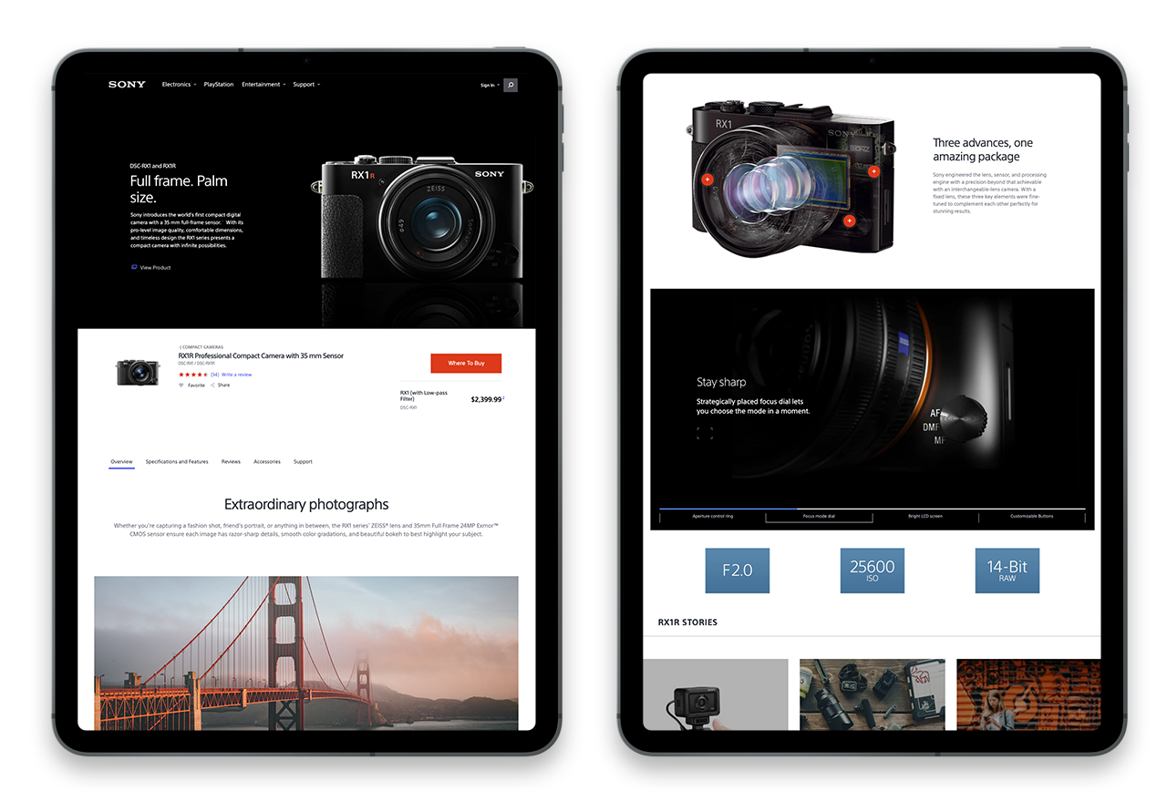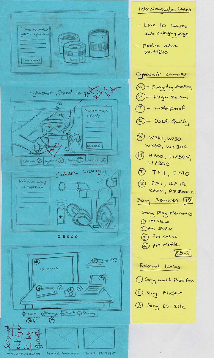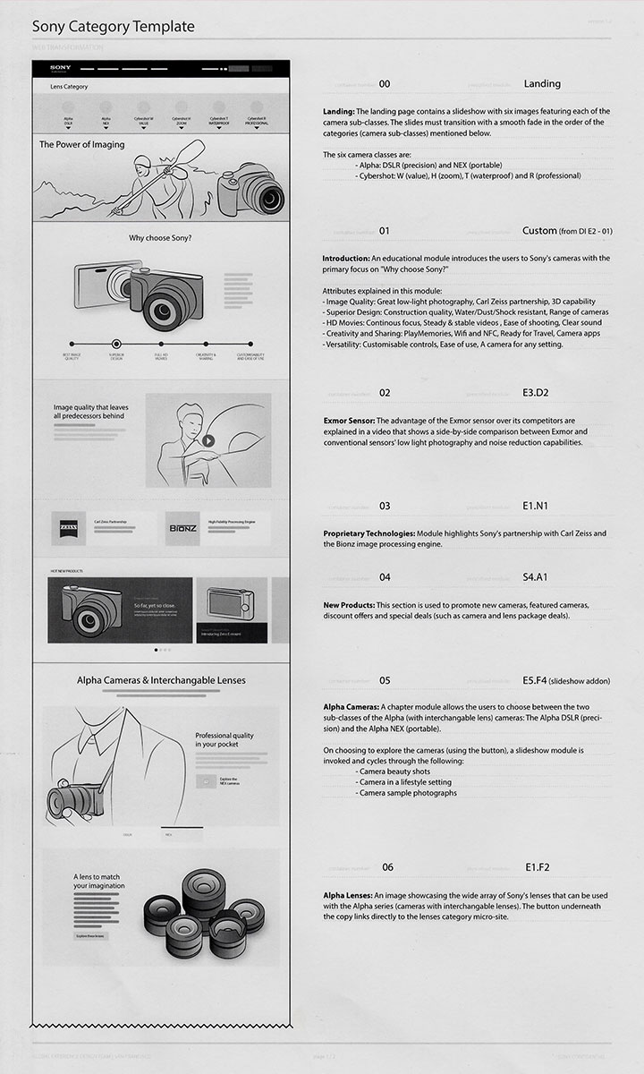 The category page orients users to category brands and products provide access to deeper marketing pages and features Sony innovation and category related stories. The page leverages sub-navigation to provide product and series disambiguation as well as cut Sony's deep catalogue into manageable groupings.