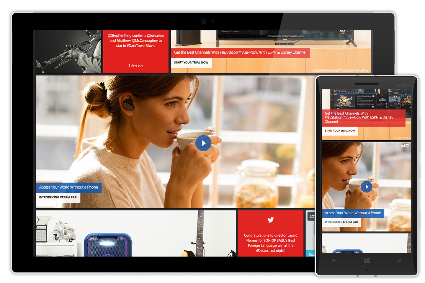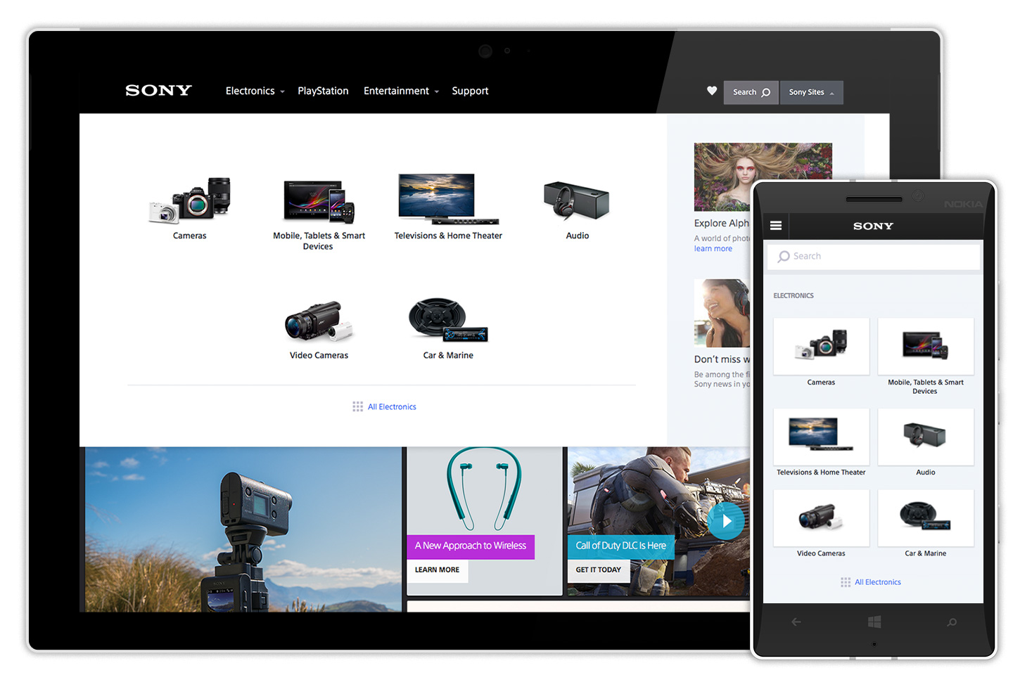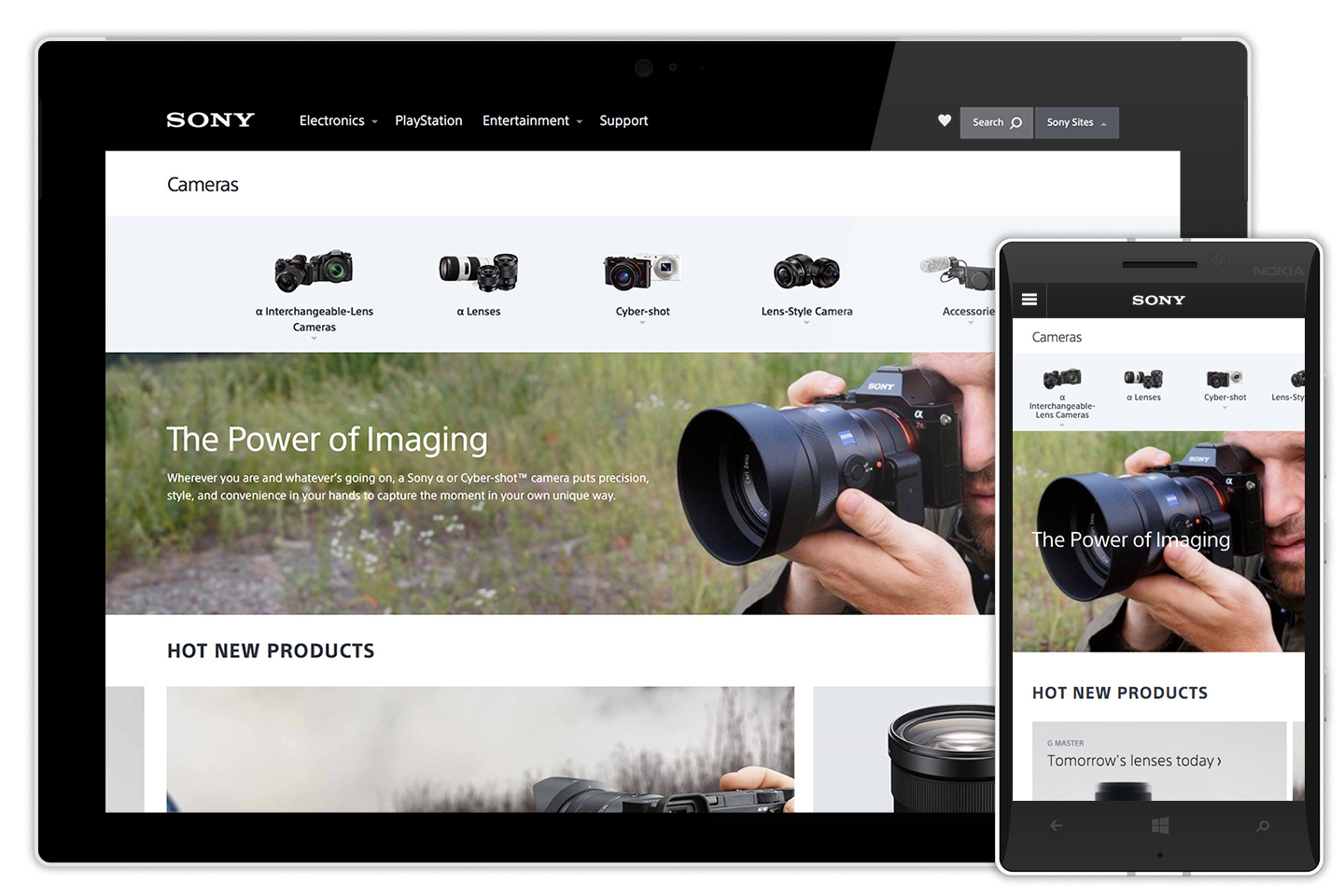The home page is divided into four main areas: a hero or feature area at the top, the body of the page featuring content from across the Sony spectrum, the bottom of the page dedicated to new and recently viewed products, and news and social buzz at the bottom of the page.
