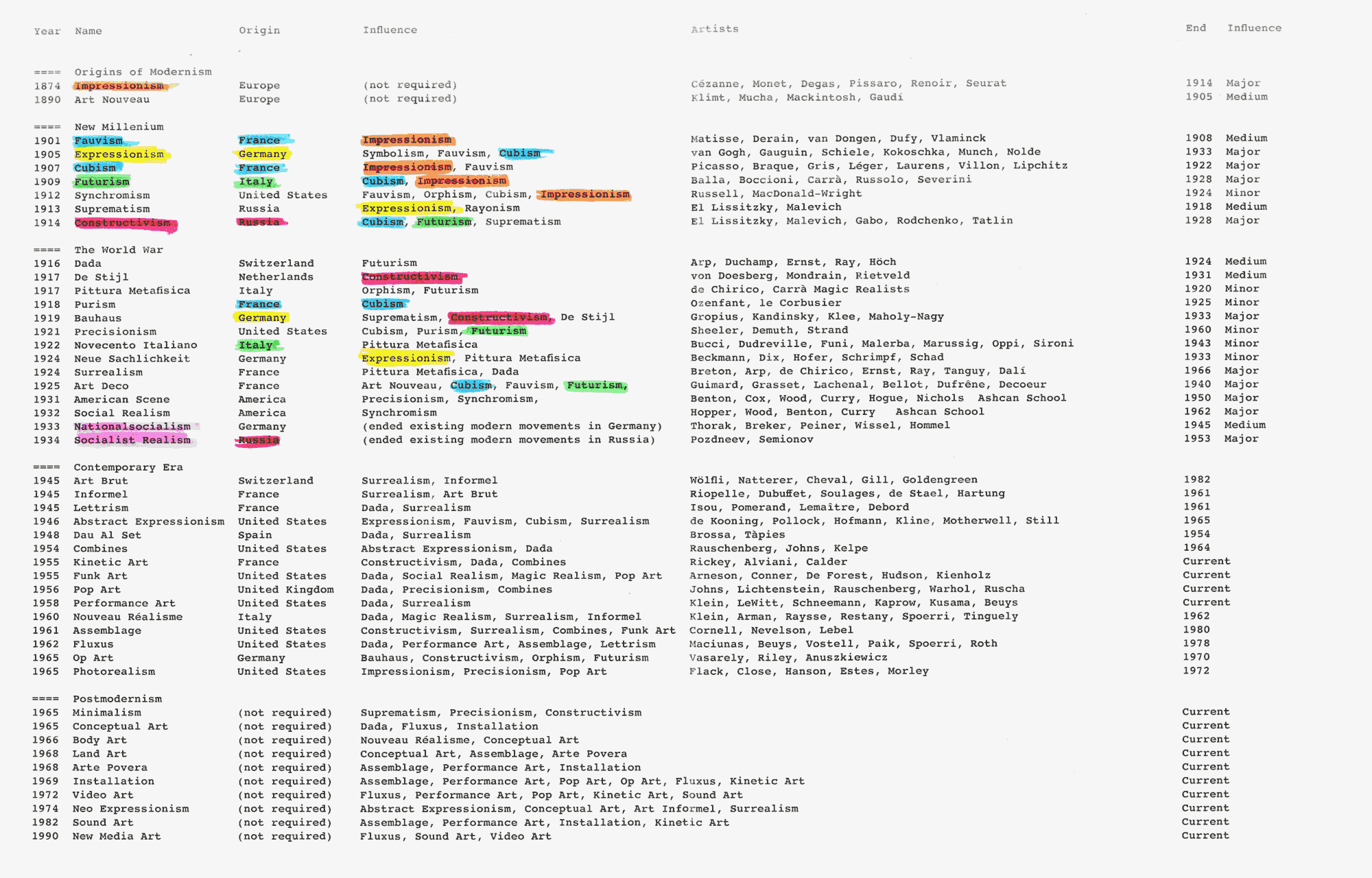 Derived from the mind-map the geographical shows art movements laid out based on their locations in the North Atlantic region. A timeline allows the user to witness how these movements influenced one another over time. In addition to geographic accuracy, the layout gives special importance to historic events in the modern era and their direct influence on modern art.