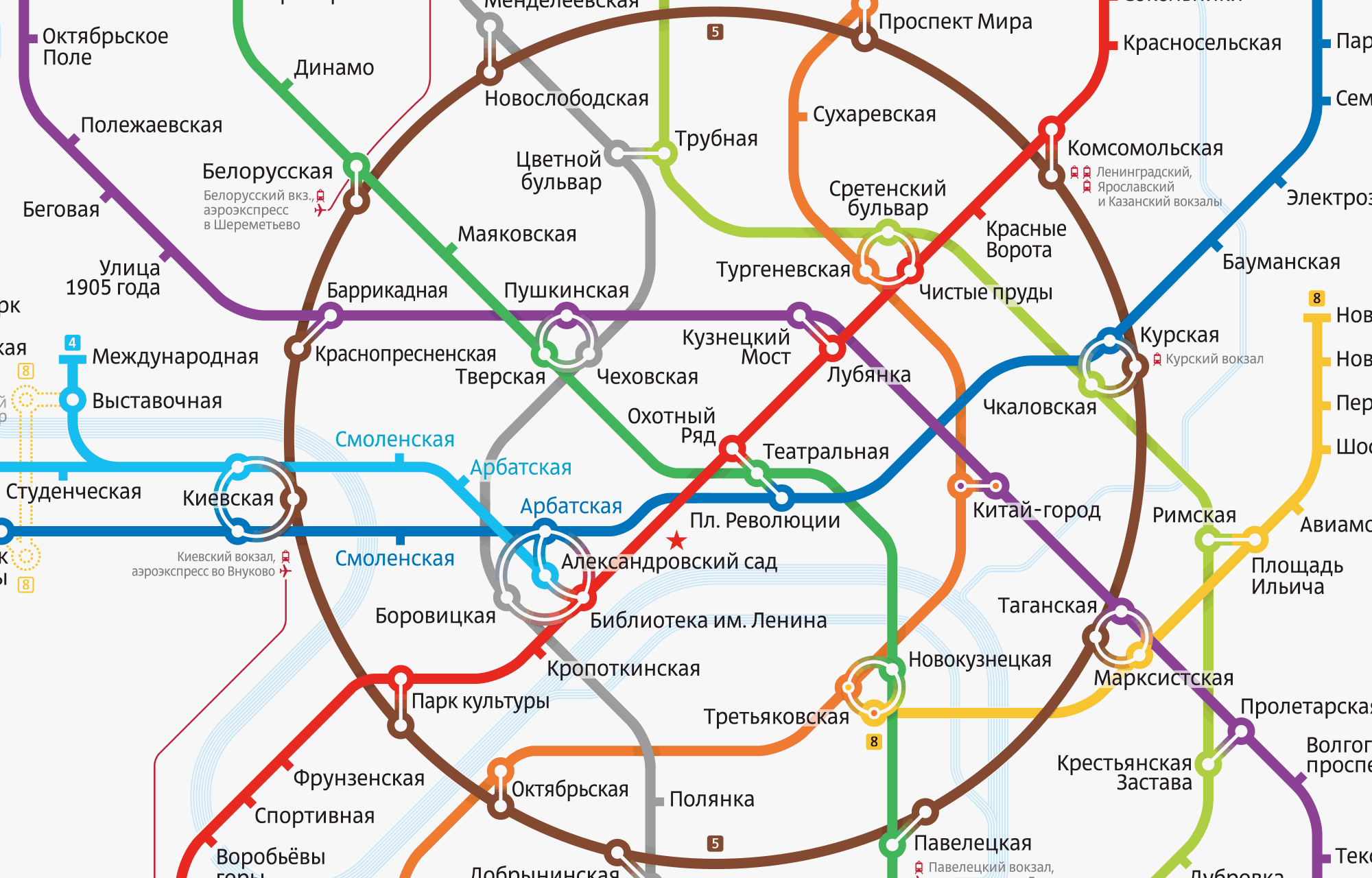 This project takes inspiration from one of the most heavily used rapid transit system in the world, the Moskovsky Metropoliten. As of 2013, the Moscow Metro has 188 stations and its route length is over 313 kilometres. The circular line in the illustration pops out immediately, drawing your eyes to the centre of the city. The weights of the circles for each station are thicker than the lines, helping give more white space to the map.