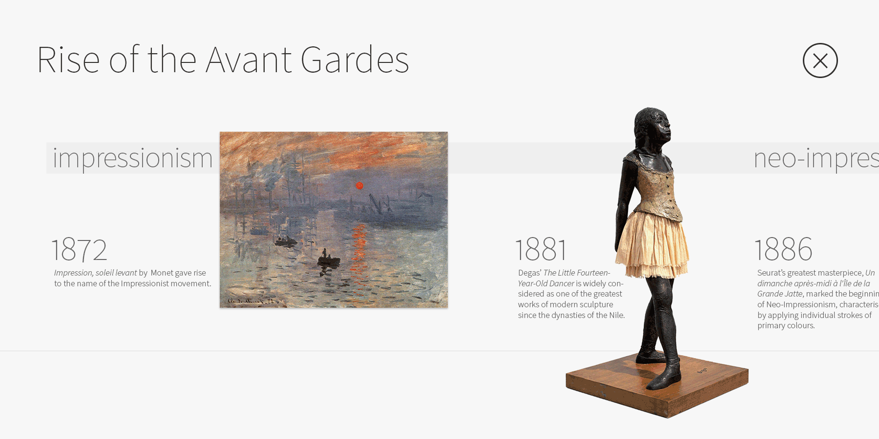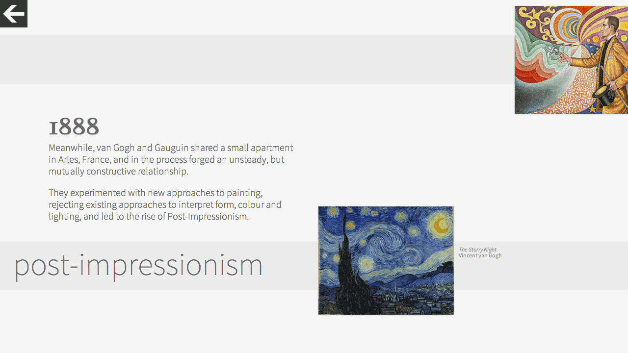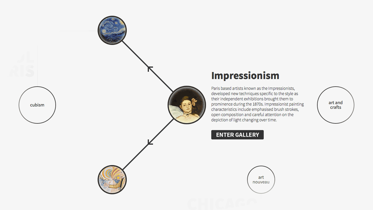 All nodes connect to a timeline that narrates the history, rise and impact of the selected style and the work of the leading figures. Also, the movements unique characteristics and historical milestones are described in detail.