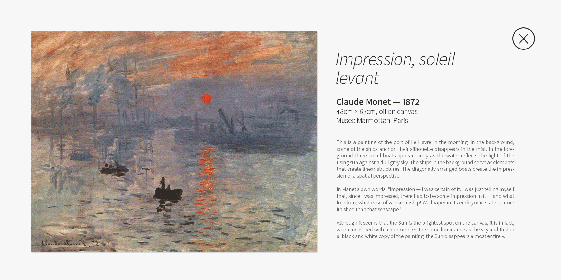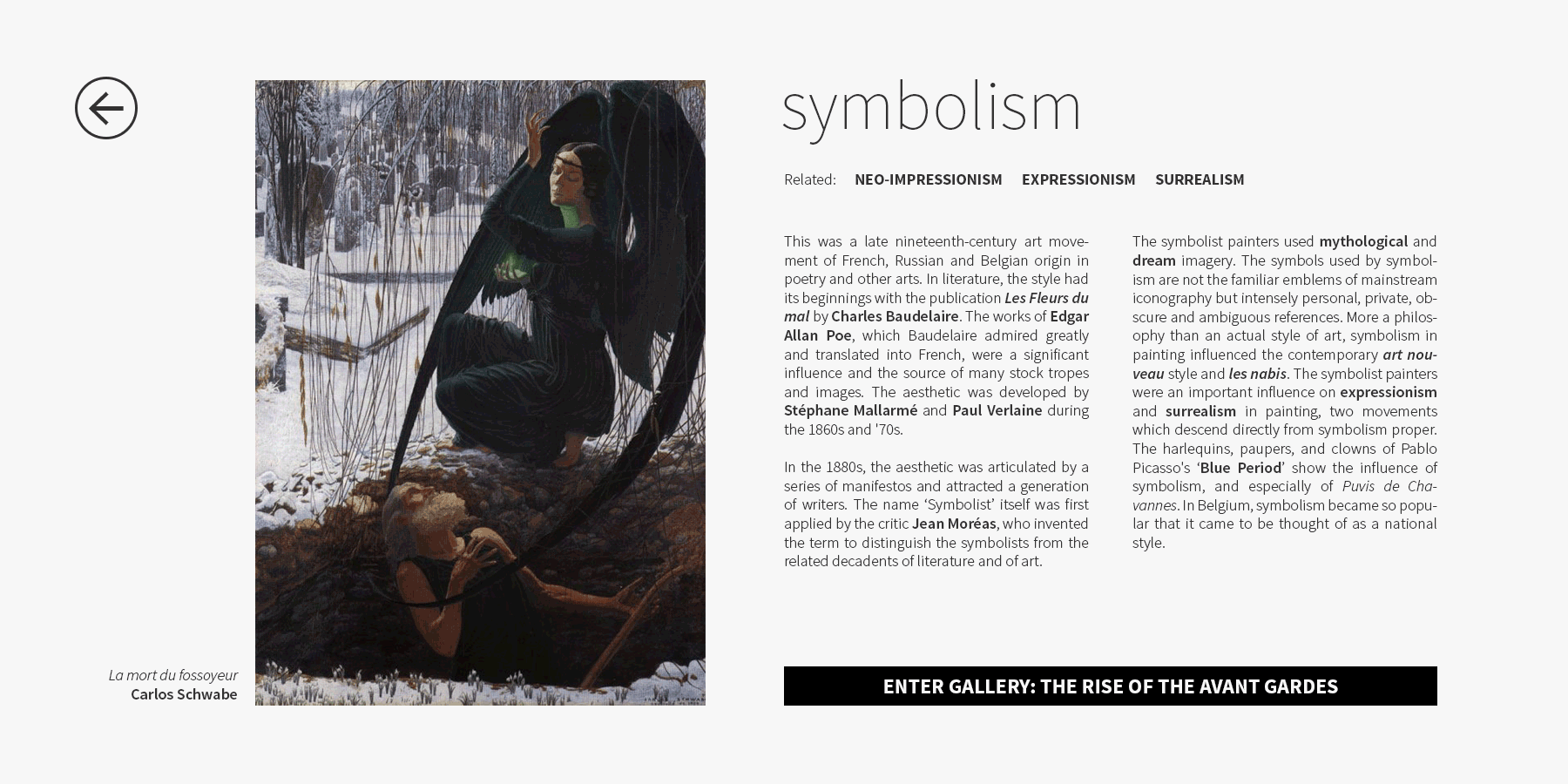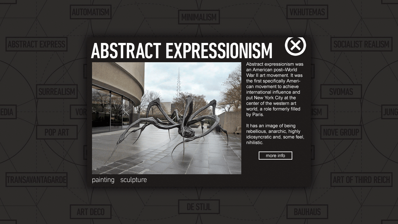 All nodes connect to a timeline that narrates the history, rise and impact of the selected style and the work of the leading figures. Also, the movements unique characteristics and historical milestones are described in detail.