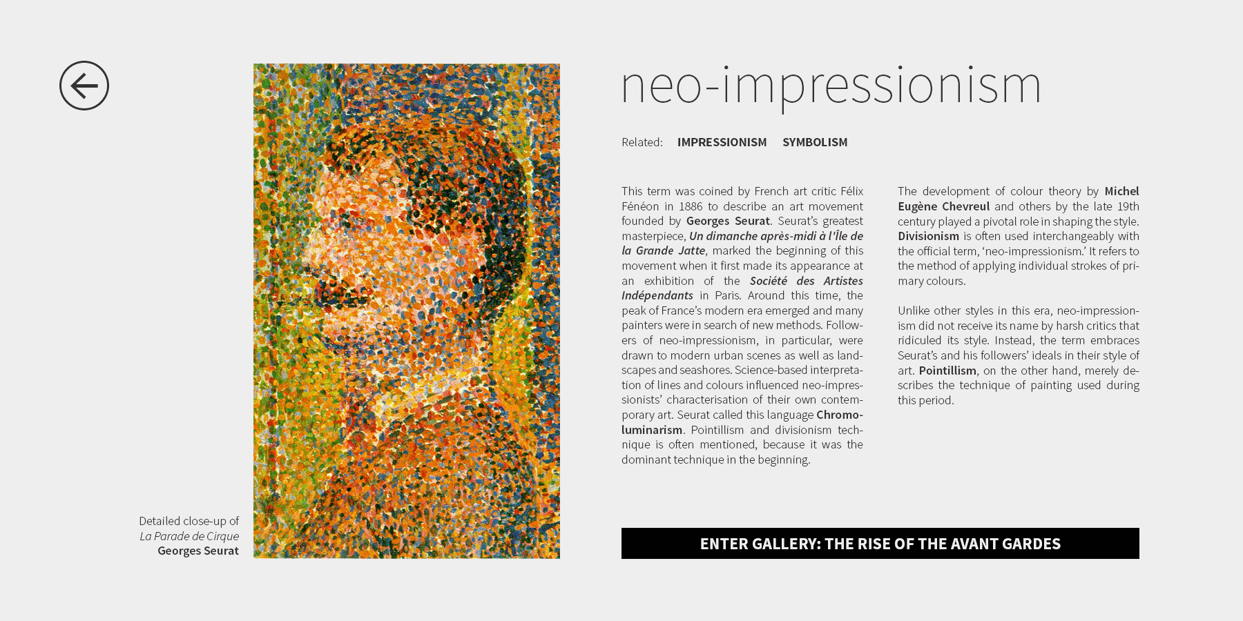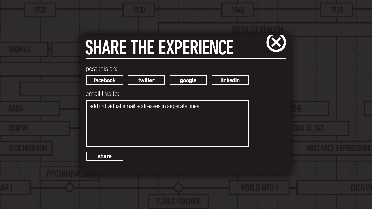 This gallery of screenshots is a walk-through of each of the component of the project shown in the teaser video above and captures the gallery, the timeline and the exhibit view's intended experience. Lastly, it shows how the final product has evolved over many design iterations from idea development, storyboards and visual designs to finally and fully experience the rise of the avant-garde.
