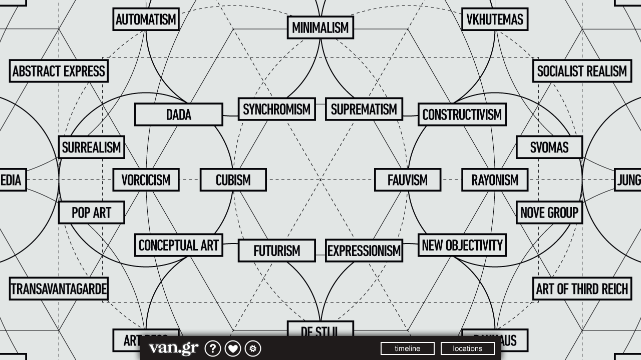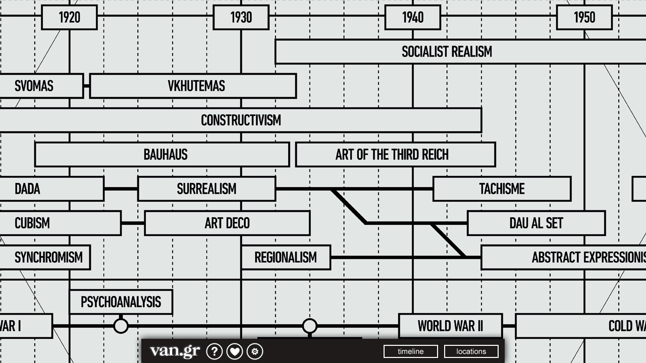 Similar to the Moscow Metro, the abstract gallery for the project faces similar challenges, displaying colossal amounts of multifaceted data within a single interactive infographic. Balanced visual elements make it easier for the user to see patterns clearly and be able to interact with the graphic using a touch-based method of interaction. Graphic elements are kept to the bare minimum with typography playing an essential role to highlight key elements of the chart, in the case of this project, the art movements. This design clearly takes inspiration from the London Underground described earlier.