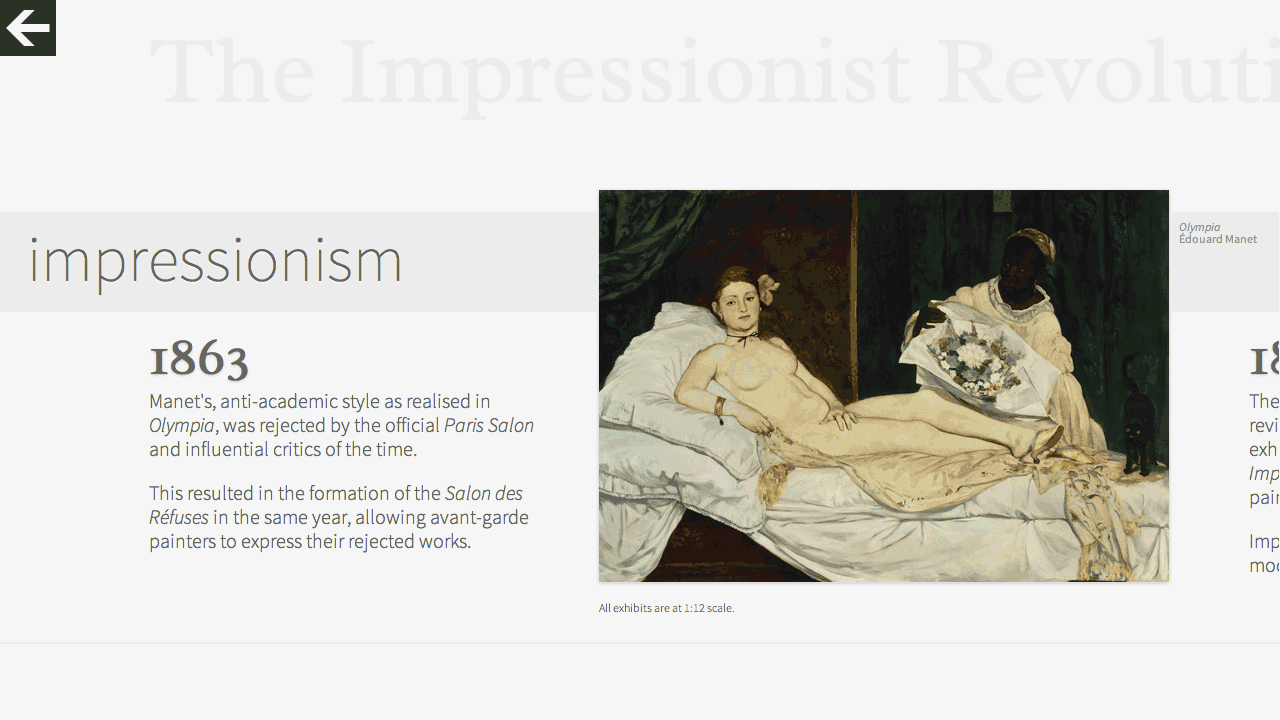 The illustration here show the timeline view that can be accessed for each individual movement. Each timeline spans over multiple interconnected movements featuring many paintings, sculptures, models and other exhibits. All exhibits scale proportionately with respect to one another. This makes it easier to interpret the true scale of the artwork as if one were in a museum.