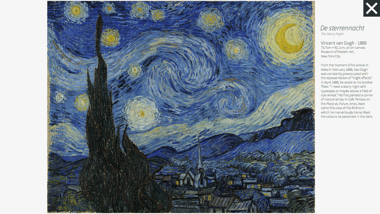 This is an interactive online guide to the evolution of modern art movements accessible on any device. As a responsive web-based application, the ideas behind modern art are explained, and the timelines to the movement are supplemented by further information as to where one can mind major collections and artworks. Arranged with plentiful illustrations, the exhibits and prose allow users to trace fascinating patterns of influence and reactions across time and place to experience the rise of the avant-garde artists that shaped modern art as we know it.