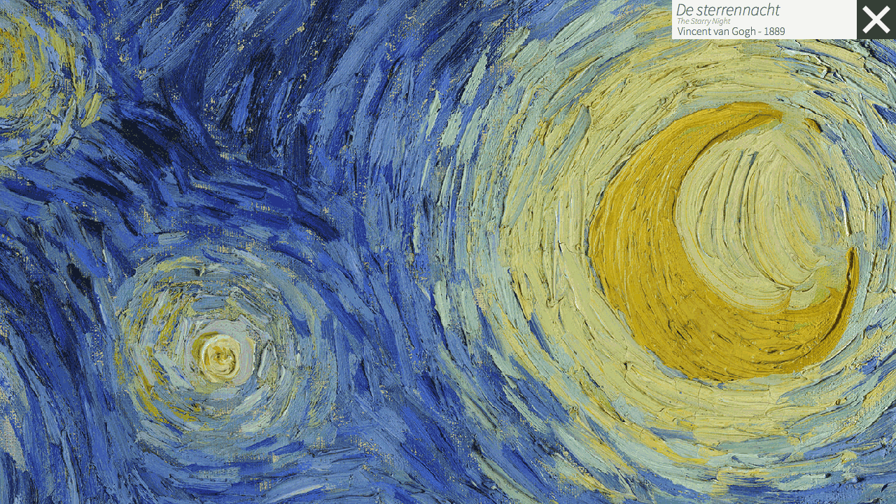 Artwork can be viewed in isolation in the exhibit viewing mode where details are available on the adjacent placard such as the name of the exhibit, artist, year of creation and where the exhibit is on display.