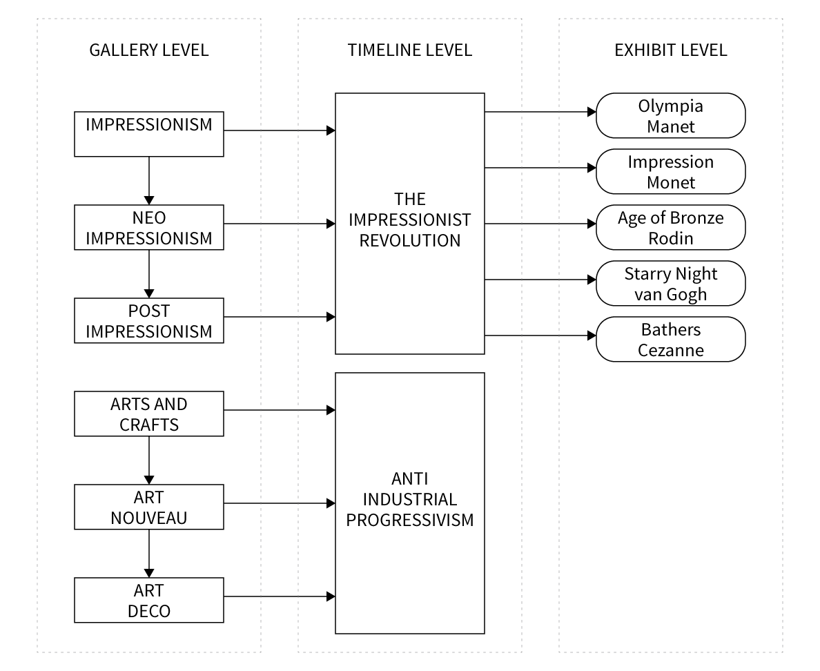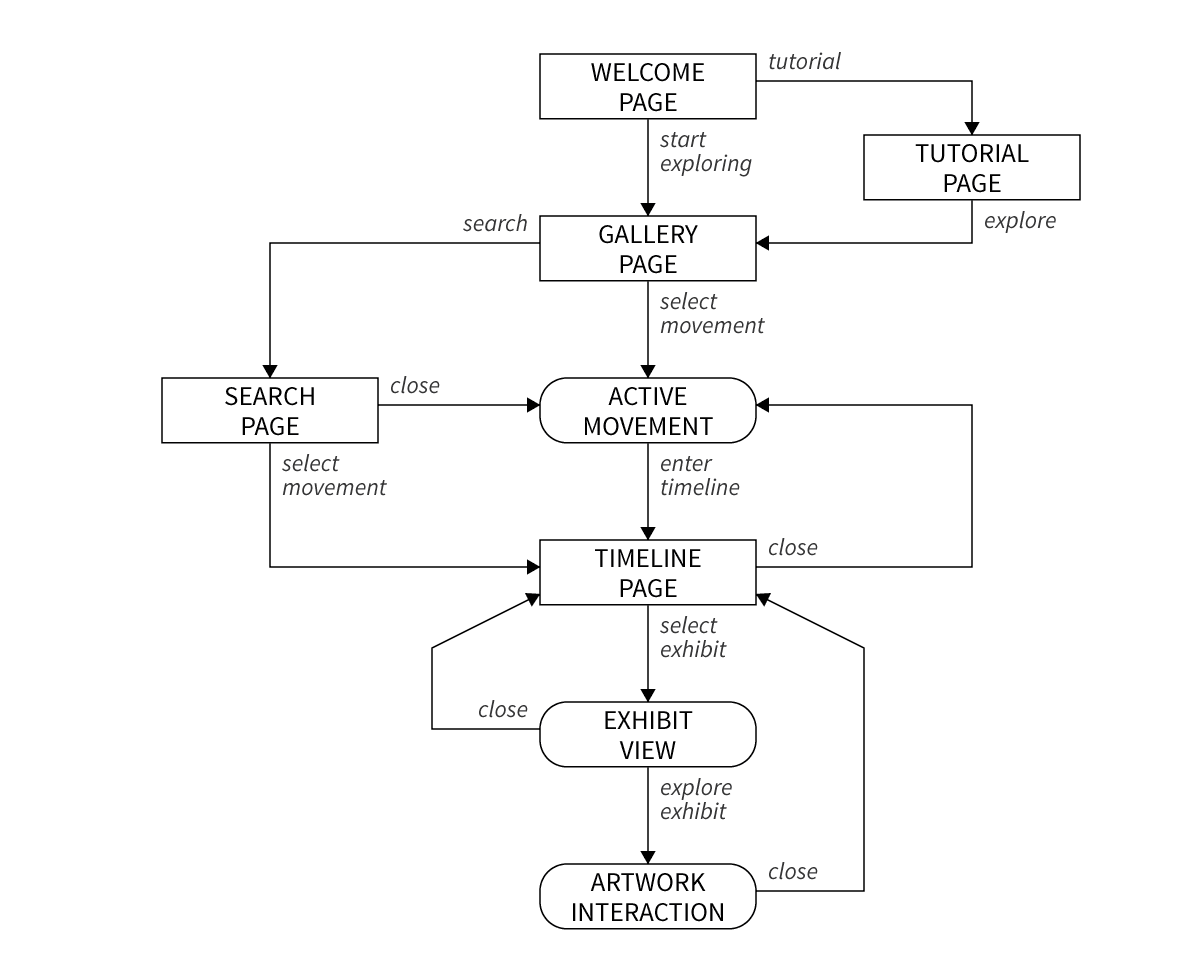The introduction page allows users to enter the gallery or view a tutorial. Users then proceed to the gallery where they can explore interconnected art movements in a chronological and a geographic layout. Each of these movements connects to specific timelines where all the exhibits may be viewed and interacted with. All timelines emerge from the gallery and lead to either other regions in the gallery or to exhibits contained in the timeline. The exhibit is an artwork in an isolation mode where unique interactions are possible. All exhibits exit back to the timeline, which in turn exits back to the gallery.