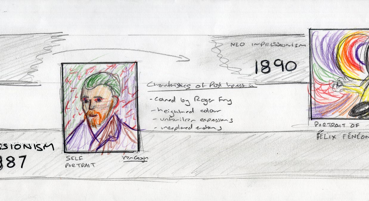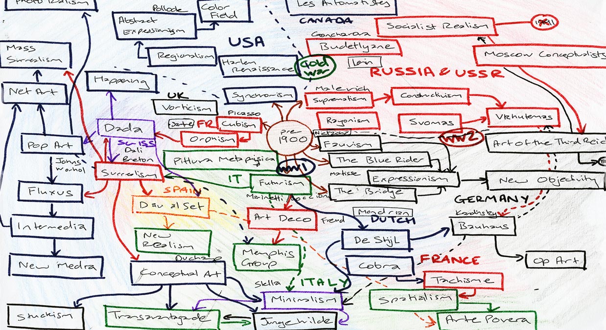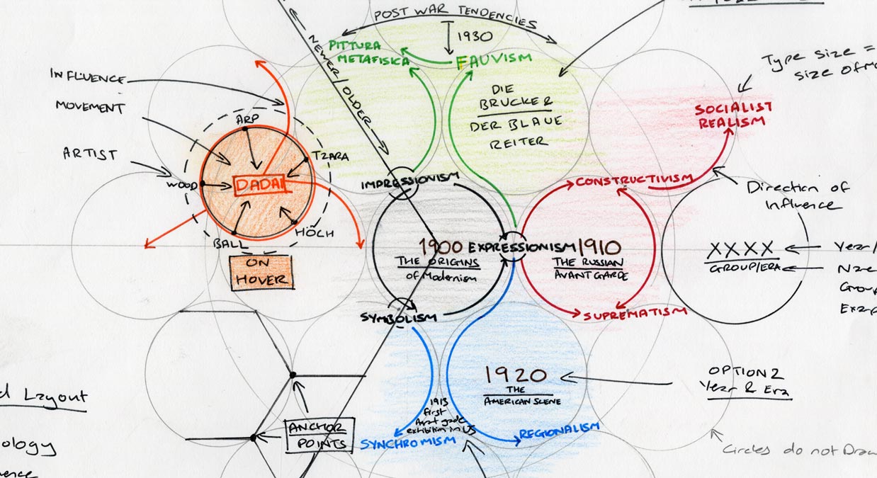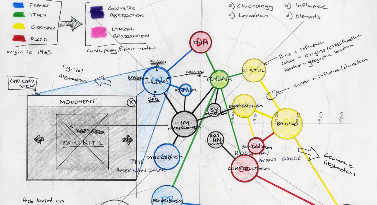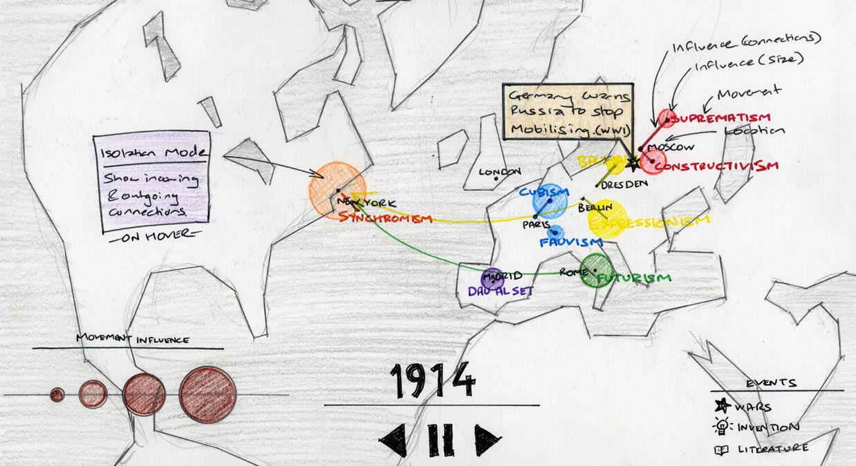 At the very beginning, these sketches were developed for the project based on various design considerations such as geography, chronology and the evolution of modern art. A mind-map developed earlier in the process helped pre-visualise all the research findings. Visual elements such as colours, node sizes and positions convey countries, influence and other relationships.