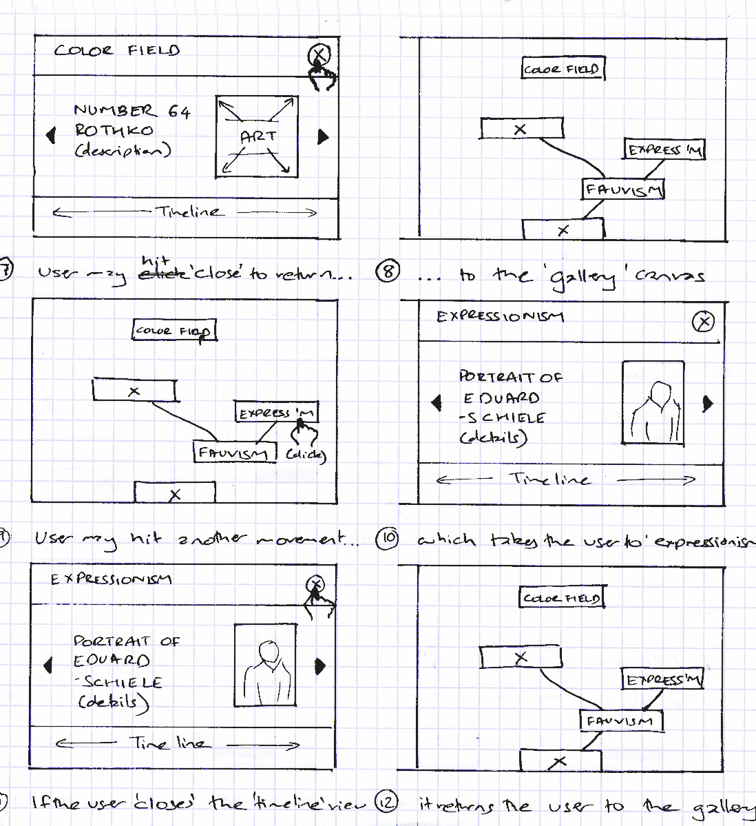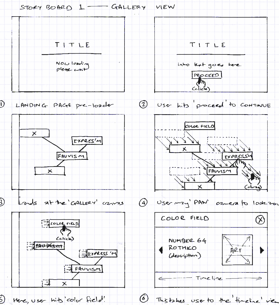 The storyboard above shows the experience of a first time user. On entering the gallery, the user pans the canvas and finally chooses the art movement called 'Color Field' and enters the timeline. After viewing, the user exits and returns to the gallery and proceeds to choose 'Expressionism' and after viewing the timeline, returns to the gallery view.