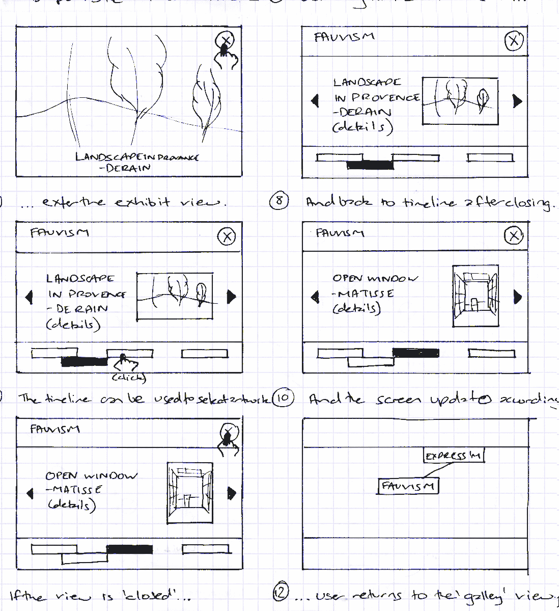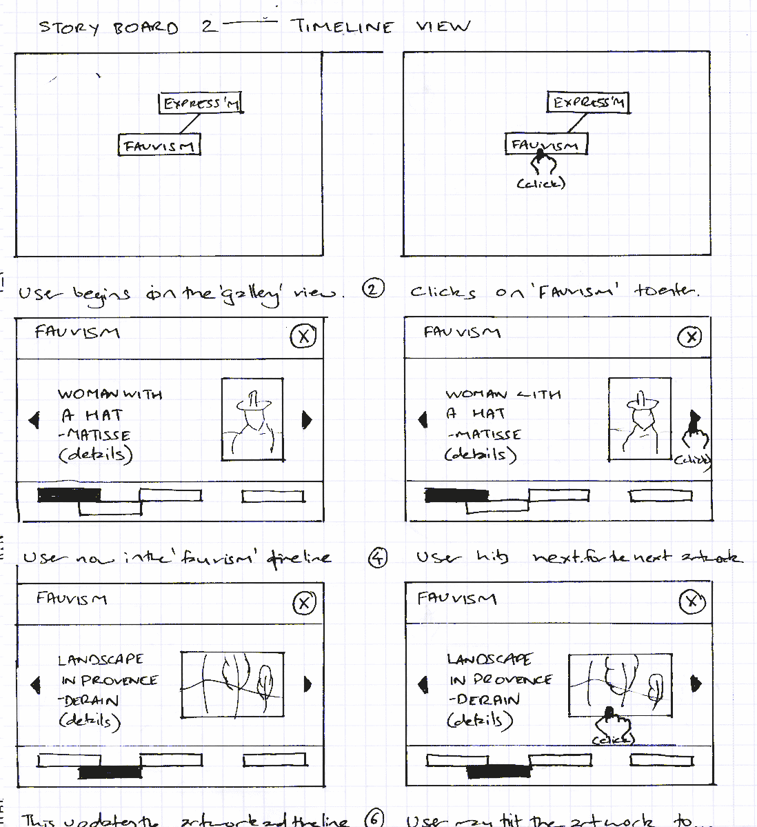The next shoryboard shows a user entering the timeline for 'Fauvism' and browsing through various artworks. On interacting with the artwork 'Landscape in Provence', the user enters the exhibit mode where the artwork can be viewed in better detail. The, the user returns to the timeline and views other artworks, finally returning to the gallery view.