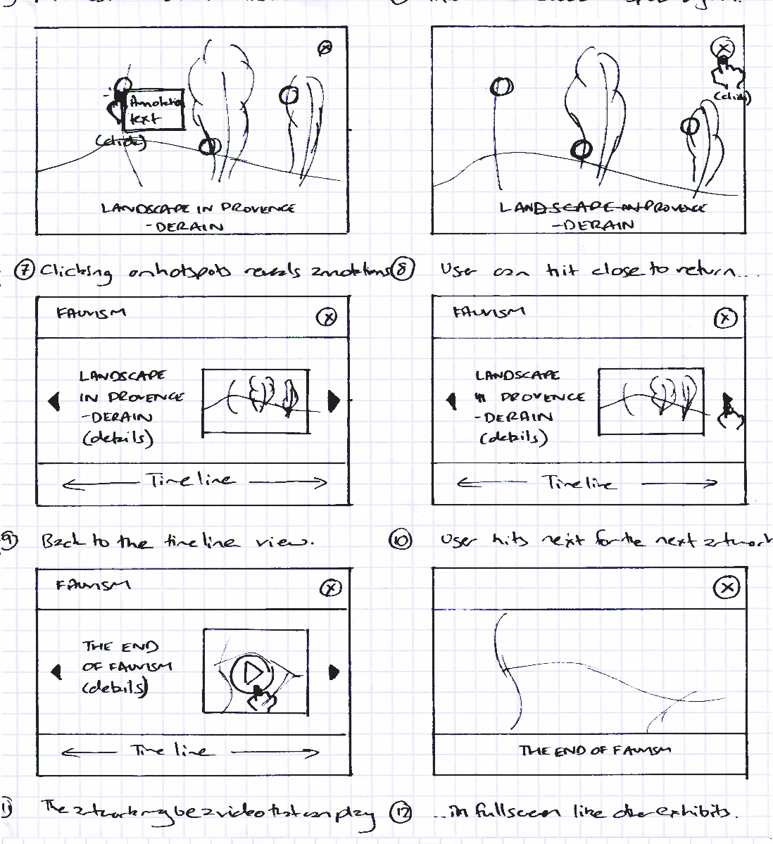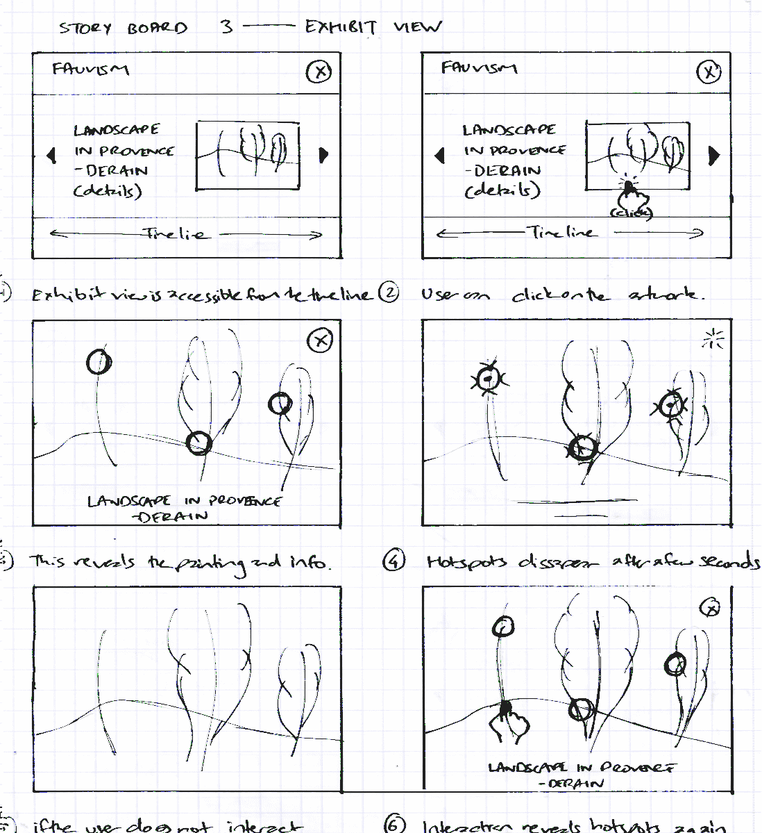 The final storyboard shows the user entering the exhibit mode for 'Landscape in Provence' and interacts with the painting using interactive image hot-spots. Each of these hot-spots present more details on the specific characteristics of the painting's attributes. Upon returning to the timeline, the user then interacts with a video module for 'Fauvism'.