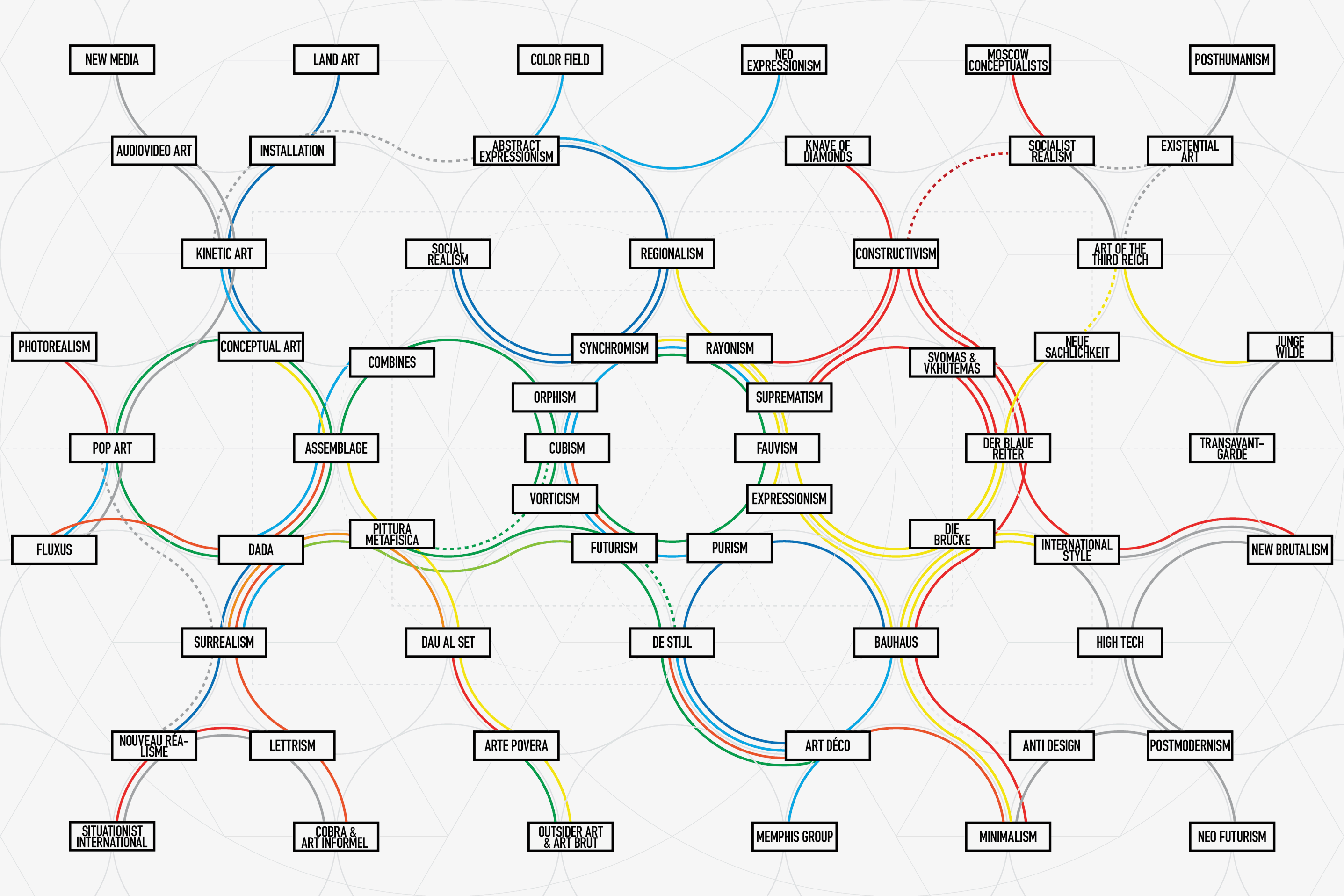 An alternate approach spreads all the art movements in a uniformly spaced chronological layout on a hexagonal grid. Primary importance was given to chronology with the roots of modernism at the centre and post-modern movements branching outwards. The layout allowed for a cleaner illustration but at the cost of compromising geographical and relational accuracy.